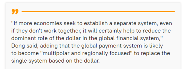 However, Dong pointed out, the initiative might gain speed because the US’ abuse of the dollar’s hegemony has pushed many economies to actively pursue a separate payment system ().