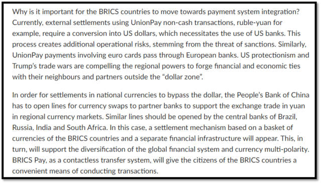 Therefore, according to Valdai, any steps the BRICS countries who are Brazil, Russia, India, China, and South Africa, take to create and maintain their own technology and infrastructure are economically viable and will help ensure the independence of the respective countries’ policies and economies (.